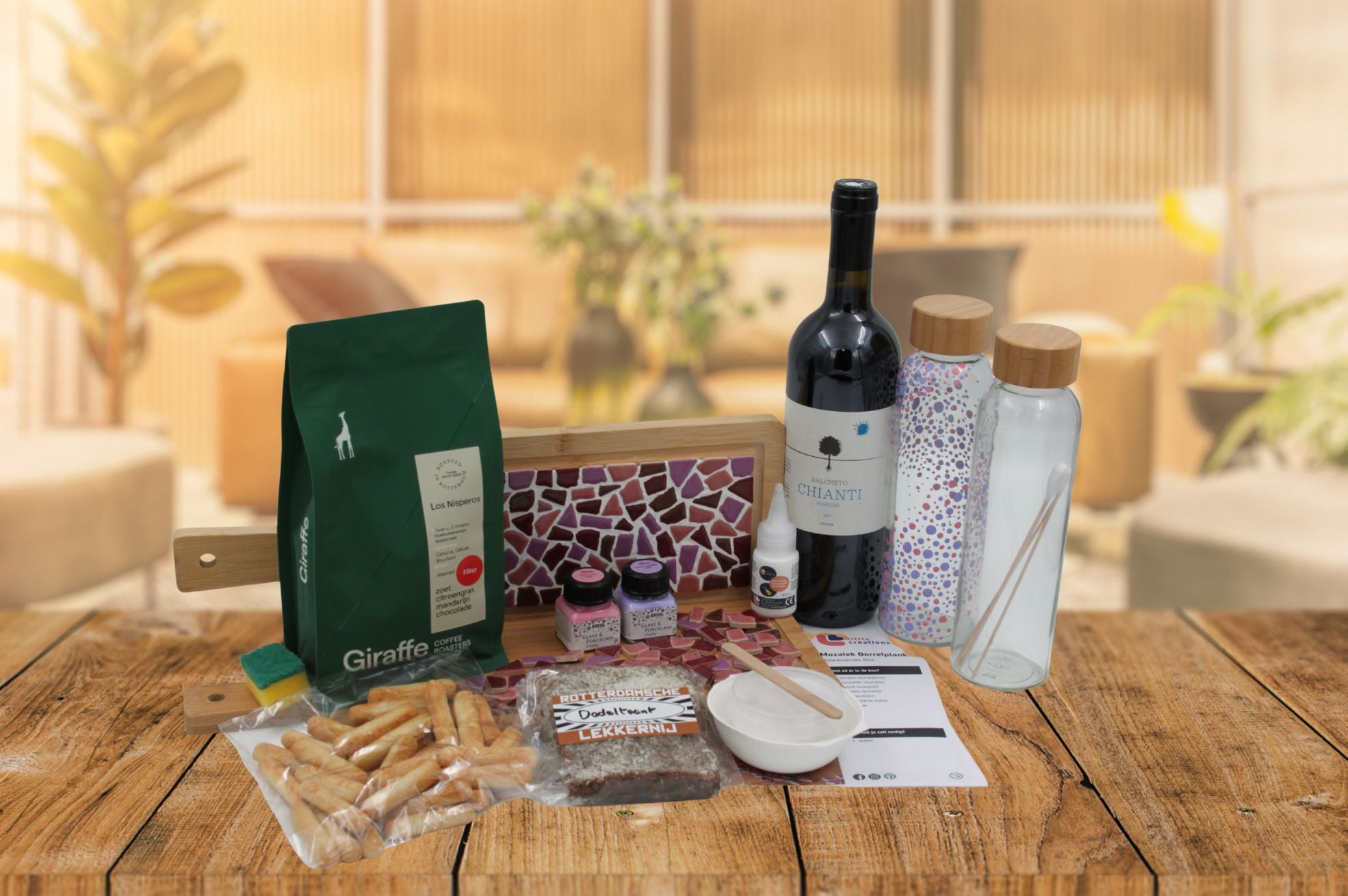 Daarnaast heb je de keuze uit een diversiteit aan streekproducten zoals bijvoorbeeld koffie, thee, wijn of chocola. Elk pakket is uniek en samen te stellen naar uw behoefte!