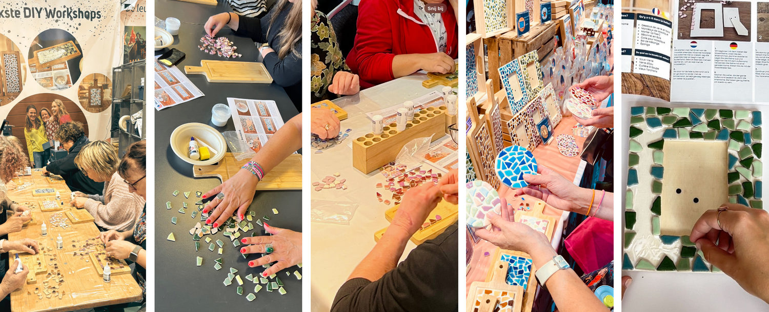 • Tijdens een 2 uur durende workshop maak je een uniek, bruikbaar product voor in huis zoals een mozaïek borrelplank, onderzetters of een kaarsenset van giethars!