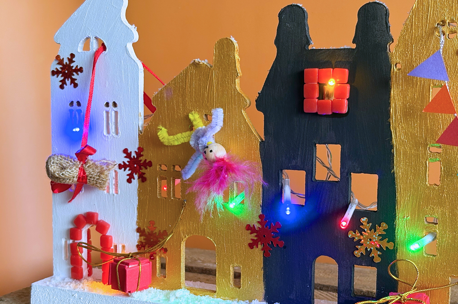 Creatief dubbelplezier met het Knutselpakket Grachtenpand. Ideaal voor sinterklaas knutselactiviteiten en kerst knutselen voor kinderen